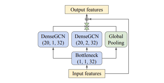 - 구체적으로, 먼저 ‘Inception DenseGCN’ 모듈은 GoogleNet의 Inception Bottleneck 모듈 구조를 활용하여 이후의 GCN 레이어에서 연산해야 할 파라미터 수를 줄인 후, Multi-scale한 로컬 특징을 추출하기 위한 커널 사이즈를 키우는 것 대신에 DeepGCNs(Lim et al., 2019)에서 제안되었던 Dilated Graph Convolution을 사용하였습니다. 또한 Global Pooling 레이어를 추가하여 글로벌한 컨텍스트 특징도 활용하였으며, Residual Connection을 통해 이전 레이어의 학습된 풍부한 특징정보들을 학습하는 구조를 설계하였습니다.(아래의 Fig 3을 참고하시기 바랍니다.)