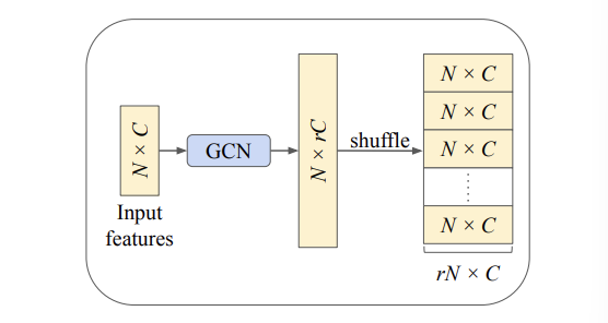 - NodeShuffle 모듈은 먼저 1개 레이어의 GCN을 통해 입력 포인트의 채널정보를 확장(Channel Expansion) 시킨 후 (C → C`), Periodic Shuffle** 방법을 통해 형태값을 재정렬시킵니다. (N x C → rN x C) (아래의 Fig 2를 참고하시기 바랍니다.)