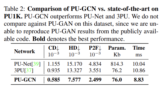 - 평가 검증지표로써, 저자들은 이전 연구들과 동일하게 Chamfer Distance (CD), Hausdorff Distance(HD), Point-to-surFace Distance (P2F)를 사용하였으며, 추가적으로 전체 학습파라미터 수와 추론속도를 함께 제공하여, 기존 모델대비 PU-GCN의 빠른 학습속도와 향상된 성능을 증명하였습니다.