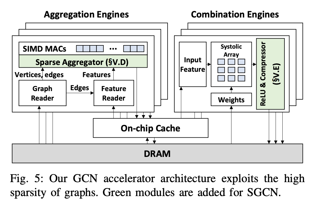 - 위 원인을 해결하기 위해 본 논문에서는 크게 1. 데이터 희소 형태 개선 2. GCN 아키텍쳐 개선 를 시도합니다. 쉽게 말해보자면 Sparse 를 효율적으로 다루기위해 CSR 에서 Bitmap-index 방식을 차용하여 키 값을 포함하는 행의 주소를 cacheline 에 제공합니다. 그리고 입력된 정보들을 Tiling 하여 유사한 희소성을 가지고 있는 이웃들을 탐지한뒤 그 희소성에 따라 집계 하기 위해 cache 마다 적절한 working set size를 적용하여 memory 의 과부하를 방지합니다. 집계되고 업데이트된 가중치를 활성화 함수에 적용하는 등 학습하기위해 임의로 잘 밀집해놓은 데이터를 다시 sparse 형태로 변형합니다. 이 과정을 반복하며 학습된 가중치가 도출되는 거죠.