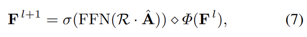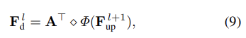 - 다음 샘플링된 포인트들이 주어지면, 그래프 컨볼루션 블록(GCN Block)에 다음 포인트를 통과시켜 저차원 특징정보들을 학습합니다. 다음 GCN Block은 본 논문에서 제안하는 공간 특징 사영(Spatial Feature Projection, SPF) 모듈이 추가된 그래프 컨볼루션 연산이 수행됩니다. 다음 과정은 식 8로 공식화하였습니다.