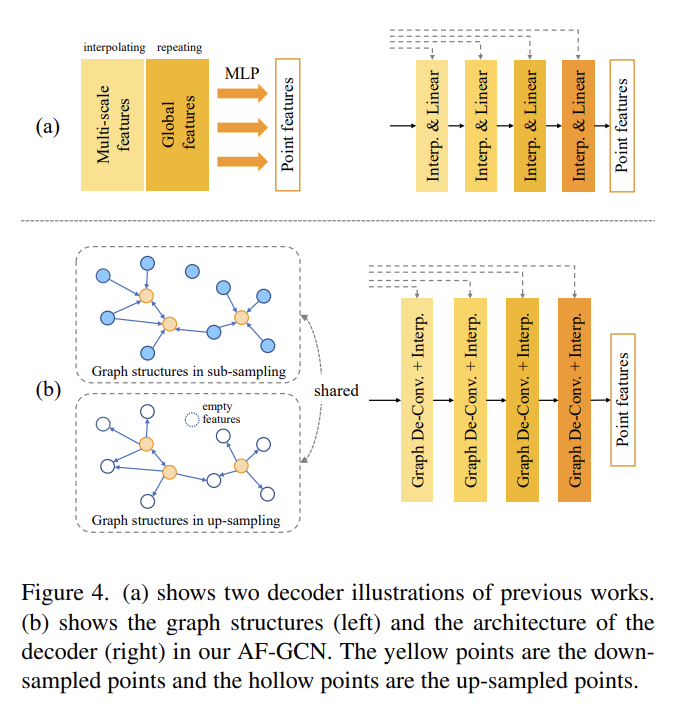 - 본 저자들은 샘플링 이전, 이후의 그래프 구조를 그대로 유지하면서(Graph-shared), 식 9로 정의한 그래프 역컨볼루션(Graph De-convolution ) 및 그 과정에서 생성되는 empty feature 포인트를 보충하기 위한 Trilinear Interpolation 순서로 디코더를 구성하였습니다. 본 설명은 식 10으로 공식화할 수 있습니다.