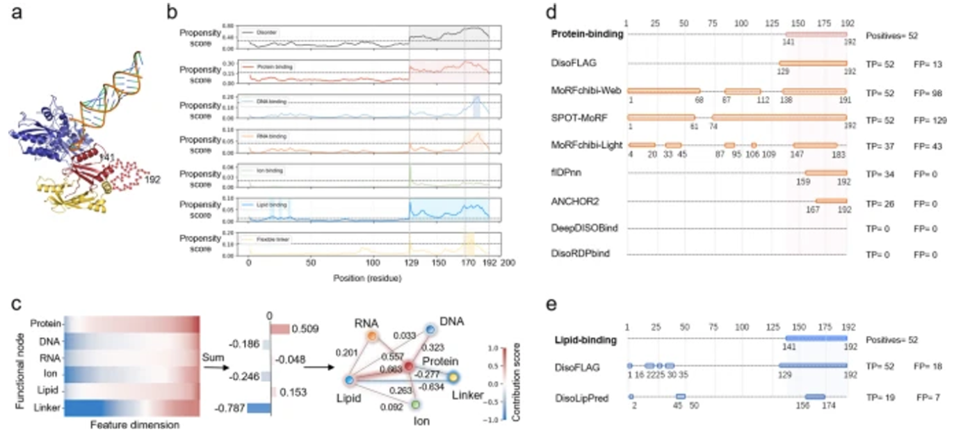 이 모델은 각 기능(장애, 펩타이드 결합, DNA 결합, RNA 결합, 이온 결합, 지질 결합, 플렉시블 링커)에 대한 성향 점수를 계산합니다. DisoFLAG는 CAID2 벤치마크와 비교하여 Dispredict3, fIDPnn, SPOT-Disorder2, AlphaFold-rsa와 같은 유사한 모델보다 우수한 결과를 보여줍니다.