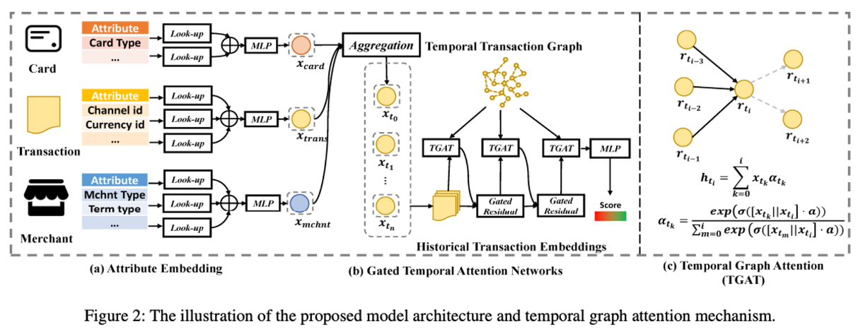 - 저자는 1. 이종 데이터 결합, 2. 시계열 그래프, 3. 위험도 임베딩 세 가지를 구현하여 그래프 딥러닝에 적용해줍니다. 먼저, 이종 데이터 결합은 각각의 이종 데이터(카드, 거래, 상점)의 특성들을 lookup-table(torch.nn.embedding)으로 매핑해줍니다. 이후, MLP(다중 레이어 퍼셉트론) 레이어를 활용해 각 특성들을 종합해 카드, 거래, 상점의 고유 난수를 만든 뒤, 그 난수들을 aggregation 해줌으로써 "언제, 무슨 카드를 활용해 무슨 상점에서"라는 맥락을 지닌 시계열 노드로 만들어줍니다.