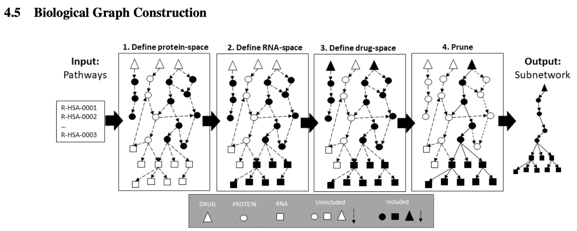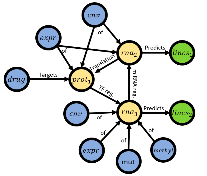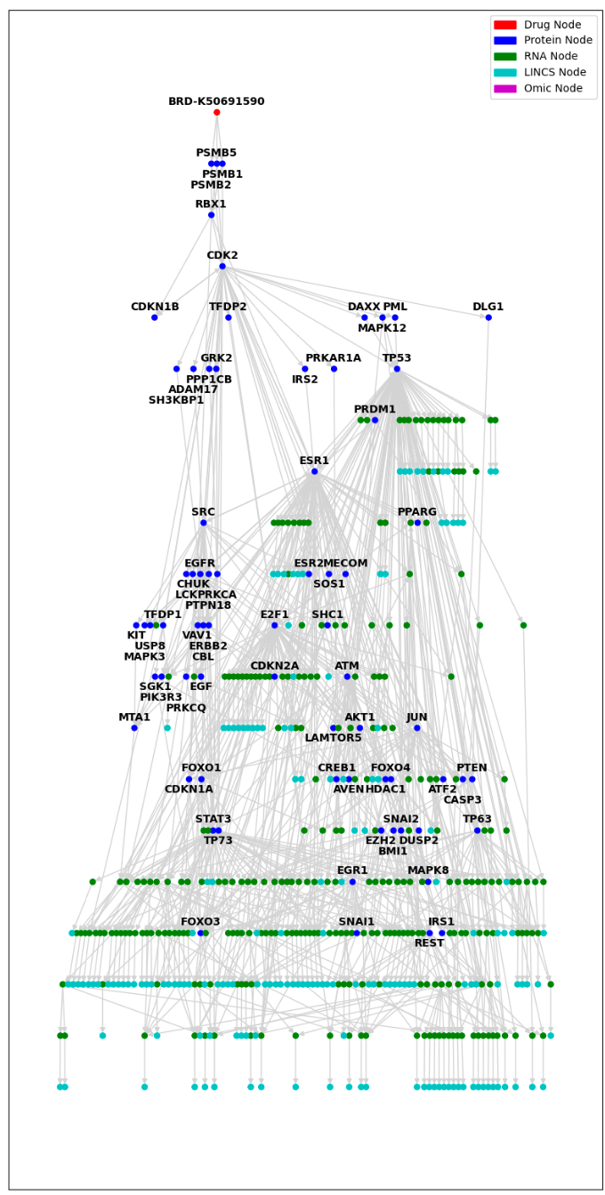 아래 이미지는 하나의 조그맣한 그래프로써, 노드들과 엣지들이 어떻게 이루어져있는지 볼 수 있다. Omics nodes는 약물, 유전자 발현량, CNV (Copy Number Variation), 변이, 그리고 메틸화로 정의가 내려져있었다. 이를 통해서 변화를 하게되는 부분은 단백질과 RNA이기 때문에 Function Nodes라 하였다. Output nodes 는 Function Nodes의 변화라 정의하였다.