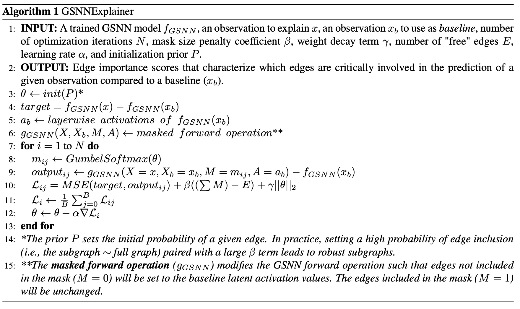 본 테이블은 GSNNExplainer 알고리즘에 대해 설명하고 있다. 이는 GSNN 모델 결과를 생물학적 해석이 동반되기 위해서, edge importance scores를 밷어내게끔 하는 알고리즘이다.Subgraphs와 그에 대한 edge importance score를 표기를 하기 위한 알고리즘이다. Gumbel-Softmax는 discrete edges sampling을 differentiable 가능케 만들어주는 방법이다. 이는 그라데이션 기반 최적화를 쓸 수 있는 의미가 되고 이는 또 최적의 edges 조합을 찾아낼 수 있는 중요한 셋팅이 된다.