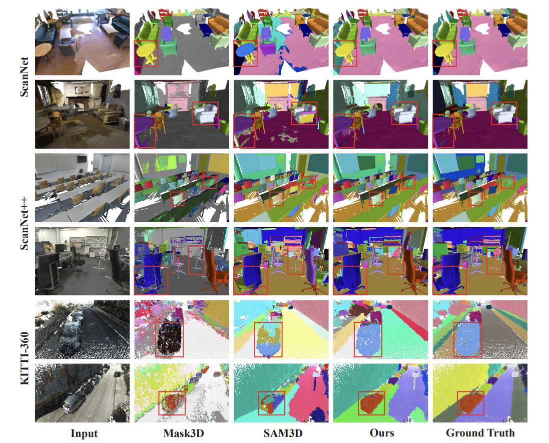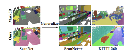 - Fig 1에서는 SAM의 강력한 일반화 성능을 갖는 Superpoint Graph을 적극 활용하여, Data-collected device gap 및 Inter-Scene gap이 많이 포함되어있는 ScanNet++, KITTI-360 데이터셋에서의 Robust한 분할 결과를 달성하는 것을 보여주고 있습니다.