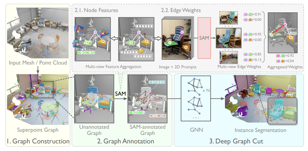 - 논문의 제목부터 살펴보게 되면, keywords로 크게 SAM, GraphCut, 3D Instance Segmentation으로 나누어볼 수 있을 것 같습니다.