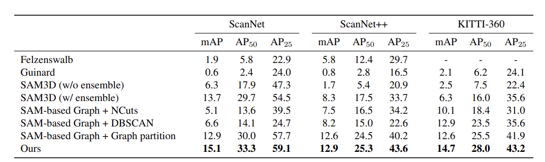 - 각 단계의 핵심을 정리해보자면, Oversegmentation to Superpoint Graph -> Annotation by SAM (+Pseudo Labeling by CropFormer) -> GraphCut by training GNN이 될 수 있겠습니다.