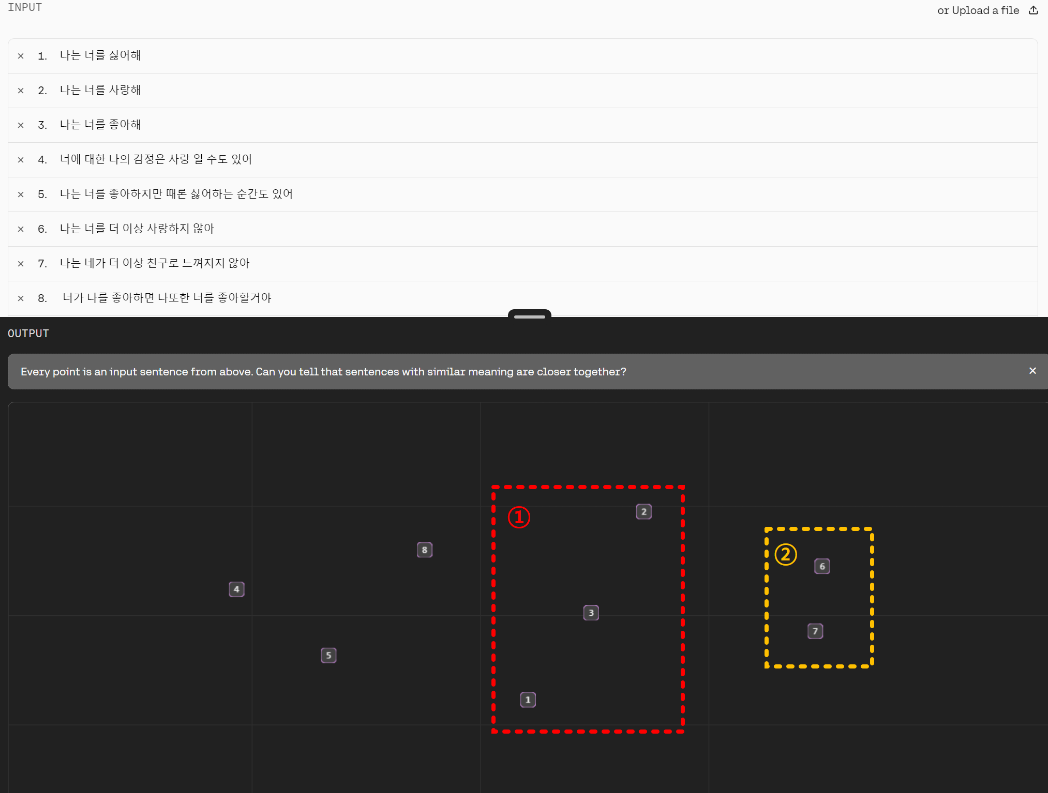 - 좌측 빨간색 상자 ①에서는 "나는 너를 싫어해" 와 "나는 너를 좋아해" 그리고 "나는 너를 사랑해" 가 유사한 공간에 위치하고 있음을 볼 수 있습니다. 좋아해를 기점으로 사랑해와 싫어해로 나뉘어져 있는 부분이 신기합니다.