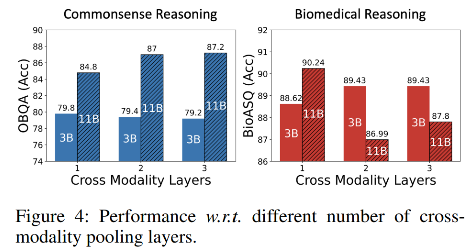 - 그림4의 결과가 굉장히 흥미롭습니다. text 와 graph 정보를 잘 조합하는 역할을 하는 Cross modality layer가 11B LLM 모델 기준 commonsense reasoning에서는 많아질수록 성능이 오르고, 반대로 biomedical 에서는 낮아집니다.