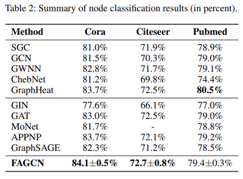 - 해당 논문에서, FAGCN이 대부분의 기존 GNNs (GCN, GAT)의 일반화 형태 꼴로 표현가능하며, 이론적으로 FAGCN의 향상된 표현력을 설명합니다. 또한 Table 2에서 그래프 벤치마크 데이터셋 상에서 진행한 실험 결과를 기반으로, Over-smoothing 문제를 완화할 수 있음을 저자들은 언급합니다.