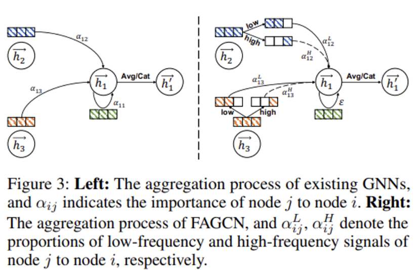 - Fig 3은 기준 모델 GAT와 제안하는 FAGCN의 학습 메커니즘 혹은 메세지 집계 과정을 보여주고 있으며, 주목할 점은 이웃 노드들의 원본 신호를 필터링하여 분리한 각각의 주파수 성분에 가중치 alpha를 다르게 부여하여 그 중요도를 학습하도록 설정한 것입니다. 다음의 핵심 포인트 부분은 논문의 Remark 3에 기술되어 있습니다.