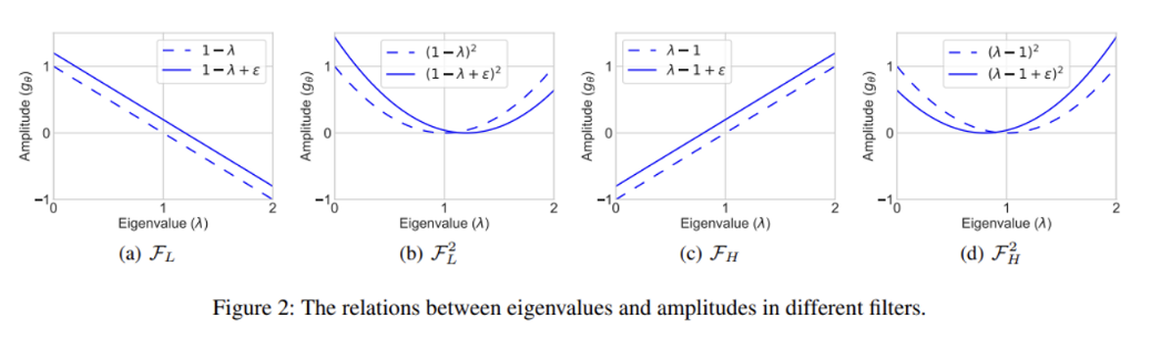 - Fig 2는 저자들이 설계한 ‘향상된’ 저주파수 및 고주파수 필터 (실선)와 기준 모델로 선택한 GCN 필터 (점선)의 비교를 나타냅니다. 여기에서 저자들은 각 주파수 요소를 더욱 잘 포착하기 위해 sigma 파라미터를 추가하였으며, 음의 크기를 방지하기 위해 제곱 꼴의 형태로 필터를 설계하였다고 합니다.