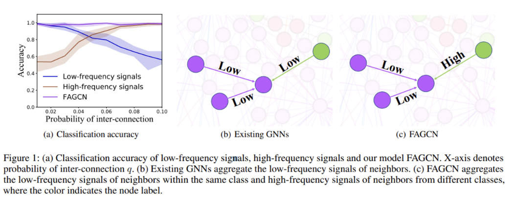 - 다음 논문에서, 저자들은 그래프 상 타겟 노드 혹은 그 이웃노드들로부터 전파되어지는 정보들의 다른 신호들을 적응적으로 집계할 수 있는 FAGCN (Frequency Adaptation Graph Convolutional Networks)를 제안합니다.