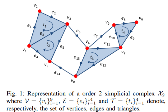 - Fig 1와 같이, Simplicial complex 구조의 그래프 상에는 크게 3가지 요소들이 존재합니다. 노드, 엣지, 그리고 그들로부터 이루어지는 면이 있습니다. 그리고 엣지 및 면 상에는 화살표로 표기되어 있는 방향성 (Orientation) 정보 또한 존재합니다.