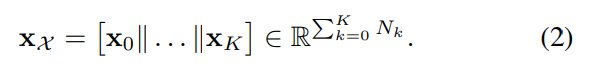 - k-simplicial signal은 컴플렉스 상의 모든 k-simplices (노드, 엣지, 면 등)를 실수 공간으로 맵핑하는 일종의 임베딩 함수 집합으로 정의됩니다. 구체적으로는 식 1의 신호 집합들을 최대 K차수만큼 Concatenate하여 식 2와 같이 얻어냅니다.