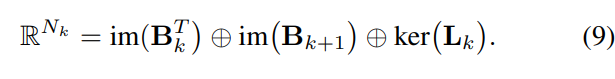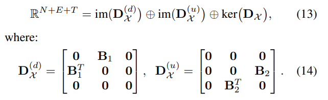 - 엣지 신호 (k=1)를 고려하였을 때, 식 9의 각 스펙트럼 공간들은 식 10의 해당 신호 요소들의 특성에 따른 명칭을 가지고 있으며 구체적으로 Gradient (with irrotational component, (a) 부분) & Curl (with solenoidal component, (b) 부분) & Harmonic space (with harmonice component, (c) 부분) 라고 칭합니다.