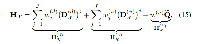 - 식 14와 15를 비교해보면, H(d) 부분은 lower neighborhoods를 만족하는 요소 상의 신호들을 집계하며 H(u) 부분은 upper neighborhoods의 경우를, 그리고 H(h)은 앞의 신호들과 독립적인 Harmonic signal을 집계하는 부분으로 해석해볼 수 있습니다.