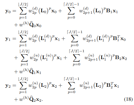 - 구체적으로, 최대차수 J/2까지의 x_0의 짝수 인덱스(2p)에 대해서만 (재귀적인) 필터링 연산이 진행되도록, x_1에 대한 필터링 연산은 최소 차수 J/2 - 1부터 홀수 인덱스(2p+1)에 대하여 진행되도록 설계하였습니다.