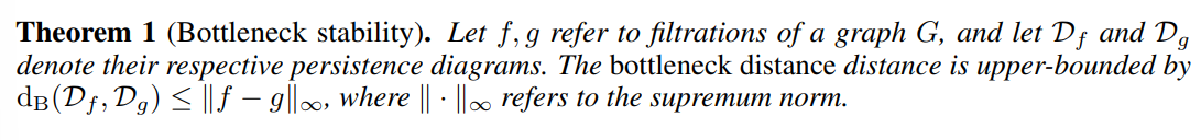 - Stability properties of filtration이란, 동일한 그래프 G에 대한 2가지 필트레이션 함수 f, g으로 뽑아낸 다른 결과의 지속성 다이어그램 (D_f, D_g)에 대하여, 두 다이어그램 상의 포인트 간 측정 거리의 상한으로 정의됩니다.