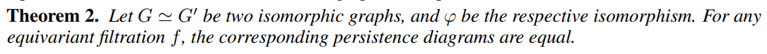 - 이러한 사실로부터 얻을 수 있는 키포인트는 Isomorphic한 그래프 상에서의 다른 구조적 속성을 어떠한 필트레이션 함수를 사용하여 뽑아낸 결과 (지속성 다이어그램)은 항상 동일하다는 사실입니다. 이러한 필트레이션의 equivariant functionality와 지속성 호몰로지는 서로 호환 가능한 점을 논문에서 밑줄로 강조하고 있습니다.