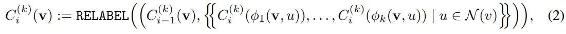 - 식 2로 정의되는 k-FWL 알고리즘의 RELABEL 함수는 색상 튜플 중 특정 색상 값으로 맵핑해주는 단사함수이며, \phi는 k-node tuples (v)의 k번째 요소를 u로 바꾸는 함수로서 하위그래프 상의 노드 간 이웃 관계정보를 인코딩하는 역할을 수행합니다.