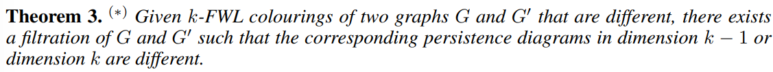 - 더욱 강력한 토폴로지 표현력을 얻어내기 위한 확장을 위해, 일반적인 0 & 1-dim의 토폴로지 구별을 너머 (k+1)-dim의 토폴로지 (e.g. voids) 정보까지 구별할 수 있는 (k+1)-FWL을 정할 필요가 있습니다.