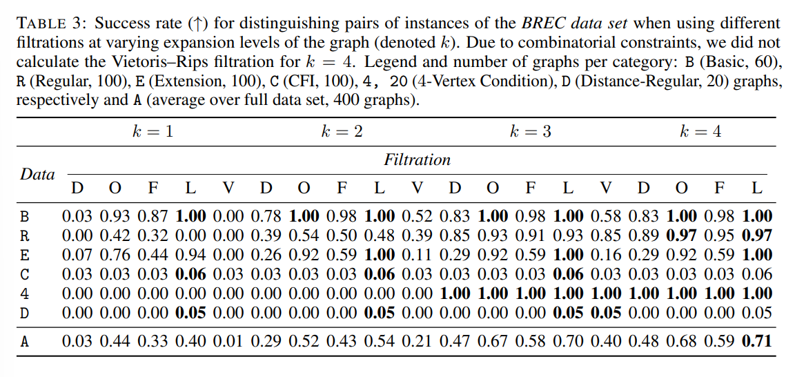 - 토폴로지 표현력을 측정하는, 1-WL의 hierarchical variant 알고리즘인 k-FWL을 통해 필트레이션의 내재적 중요도 및 가치와 지속성 호몰로지의 강력한 표현력을 이론적 증명과 실험적 결과로써 입증하였습니다. 그로부터 토폴로지 정보가 추가되었을 때, 다양한 태스크 문제에서 성능 향상에 도움이 되는 뒷받침 이유들로 충분히 커버할 수 있을 것 같습니다.