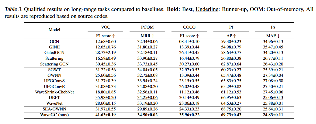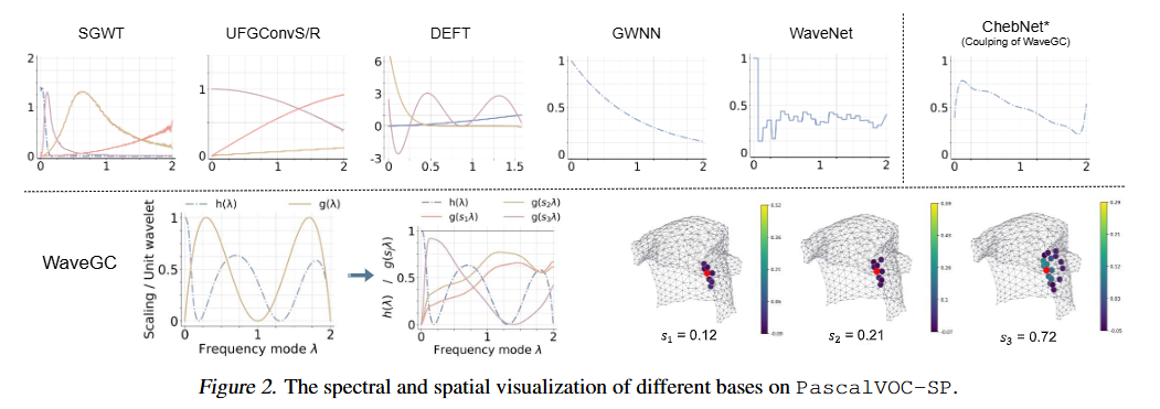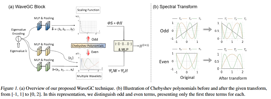 - 다중 해상도 스펙트럼 기저와 행렬 값 필터 커널을 통합한 새로운 웨이블릿 기반 그래프 컨볼루션 모델, WaveGC는 (이론적으로) Chebyshev 다항식의 홀수 및 짝수 항을 개별적으로 조합하여 웨이블릿 허용 기준을 엄격히 만족하는 학습 가능한 그래프 웨이블릿을 구축하며, (실험적으로) 다양한 데이터셋 시나리오 상에서 기존 다양한 그래프 스펙트럼 모델들을 일관되게 능가하는 성능을 보임으로써 단거리 및 장거리 정보를 효과적으로 포착하고 분리할 수 있는 WaveGC의 효과성을 입증하였습니다.