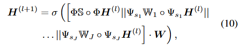 - 입력 임베딩 H(l)에 대하여 J개의 웨이블릿 기저(Ψ=Ug(sj*lambda)UT) 및 행렬 값 기반 웨이블릿 커널 (W), 그리고 한개의 스케일링 기저(Φ=Uh(lambda)UT) 및 행렬 값 기반 스케일 커널 (S)를 통해 변환된 신호들을 모두 concat합니다. 그 이후 MLP & 활성화 함수를 통과시키는 업데이트 흐름으로 진행됩니다.