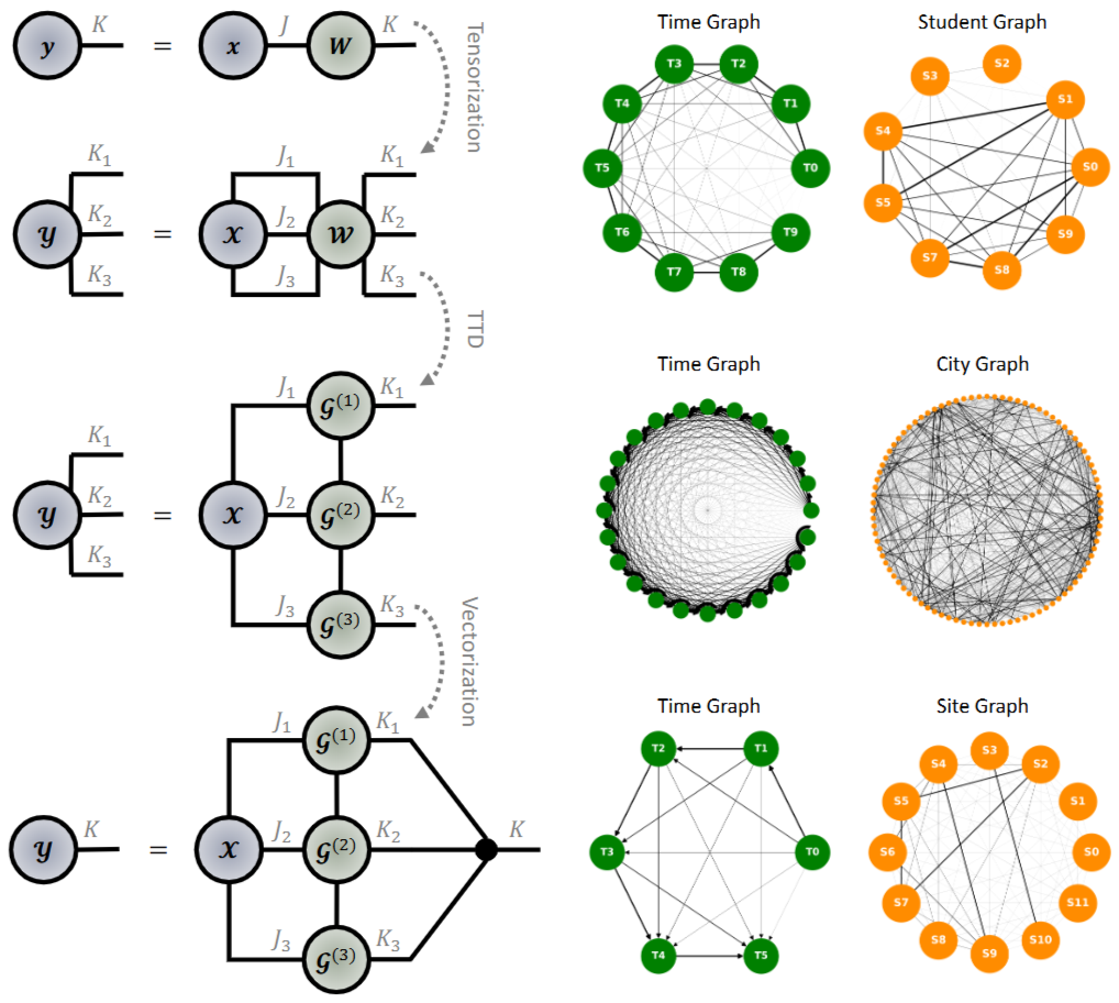 - 텐서는 벡터(1차 텐서)와 행렬(2차 텐서)을 다차원으로 일반화한 것입니다. 이러한 텐서 연산은 차원의 저주(Curse of Dimensionality)로 인한 고차 임베딩 공간의 병목 현상을 우회하고, 연산 비용을 데이터 차원에 대해 지수 함수에서 선형 함수로 줄일 수 있어서 낮은 복잡도로 대규모 데이터를 효율적으로 처리할 수 있다는 사실이 잘 알려져 있습니다.