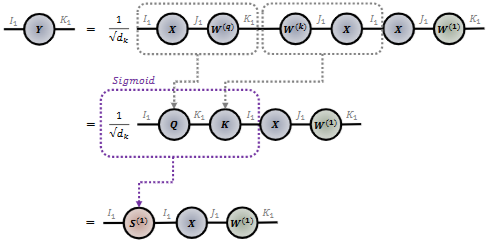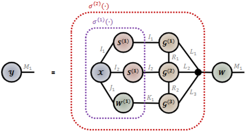 - 2차 텐서인 WJ x K를 (3 x 3)차 텐서 W(J1,2,3 x K1,2,3)으로 텐서화한 후, 3가지 텐서 코어 G(1),(2),(3)들로 분해하여 출력 벡터 y로 벡터화하는 여러 텐서 연산들의 조합을 보여줍니다.