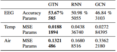 - 오른쪽 그림은 다양한 다중 태스크 (EEG : 신호 & 그래프 도메인; 온도 예측 : 온도 & 시간 도메인; 등등)에서 표현된 GTN의 유연성을 보여줍니다. 즉, 기존 신경망들 (CNN, GNN, RNN..)들의 단일 도메인에 한정되어 적용되는 한계를 극복하는 사실을 언급합니다.