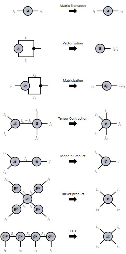 - 다양한 신경망 모델의 텐서 연산을 시각적으로 또는 직관적으로 표현 가능한 그래프 텐서 네트워크, GTN은 추가적으로 텐서화 트릭(Tensorization Trick)을 통한 압축 및 멀티 그래프 모델링 (Multi-Graph Modelling)을 통한 다중 도메인 데이터 처리가 가능합니다.