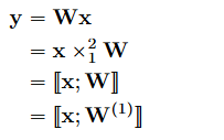 - (0 x 1 ; 1개의 특징 모드)차 입력 텐서 x와 2차 텐서인 가중치 행렬 W의 연산을 모드-1 곱셈으로 표현 가능합니다.