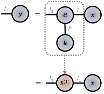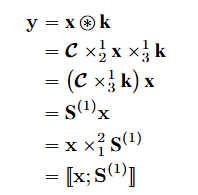- x * k = C x21 v x31 k = (C x31 k = S) x ; 컨볼루션 텐서와 1차 텐서인 v, k 간의 모드-1 곱셈을 수행합니다. 여기에서 SI x I는 입력 커널 x 상에서 커널 텐서 k를 순환시키는 역할을 수행합니다. CNN의 stride하며 컨볼루션 연산을 수행하는 것으로 바라볼 수 있습니다.