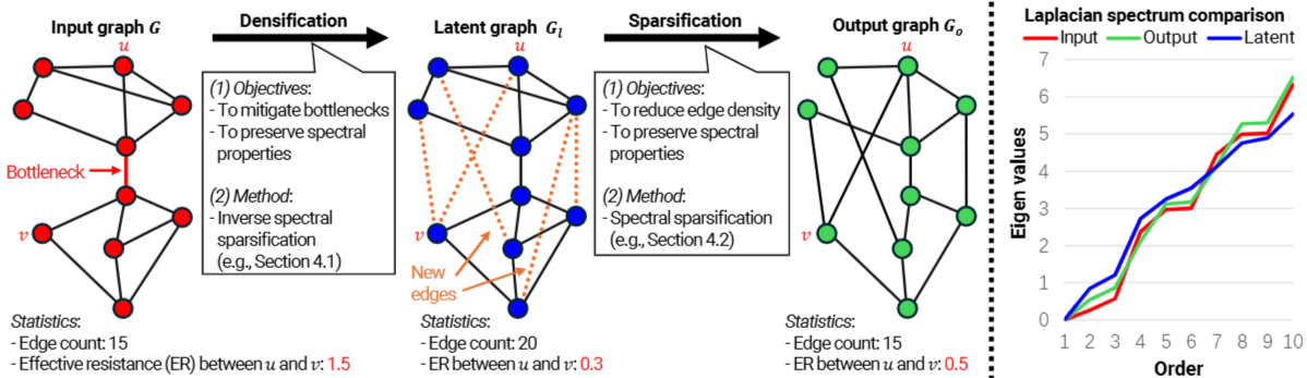 - Graph Densification : 병목 현상 및 중요한 스펙트럼 속성을 보존하기 위한 과정입니다. 입력 그래프 G를 잠재 그래프 Gl 의 스펙트럼 희소화 과정에서 주요 엣지들의 누락으로 인한 결과로 바라보고, Inverse Spectral Sparsification(Sec 4.1 참고)을 통해 이러한 누락 에지들을 복원하여 Densify시키는 방법으로 설명되어 있습니다.