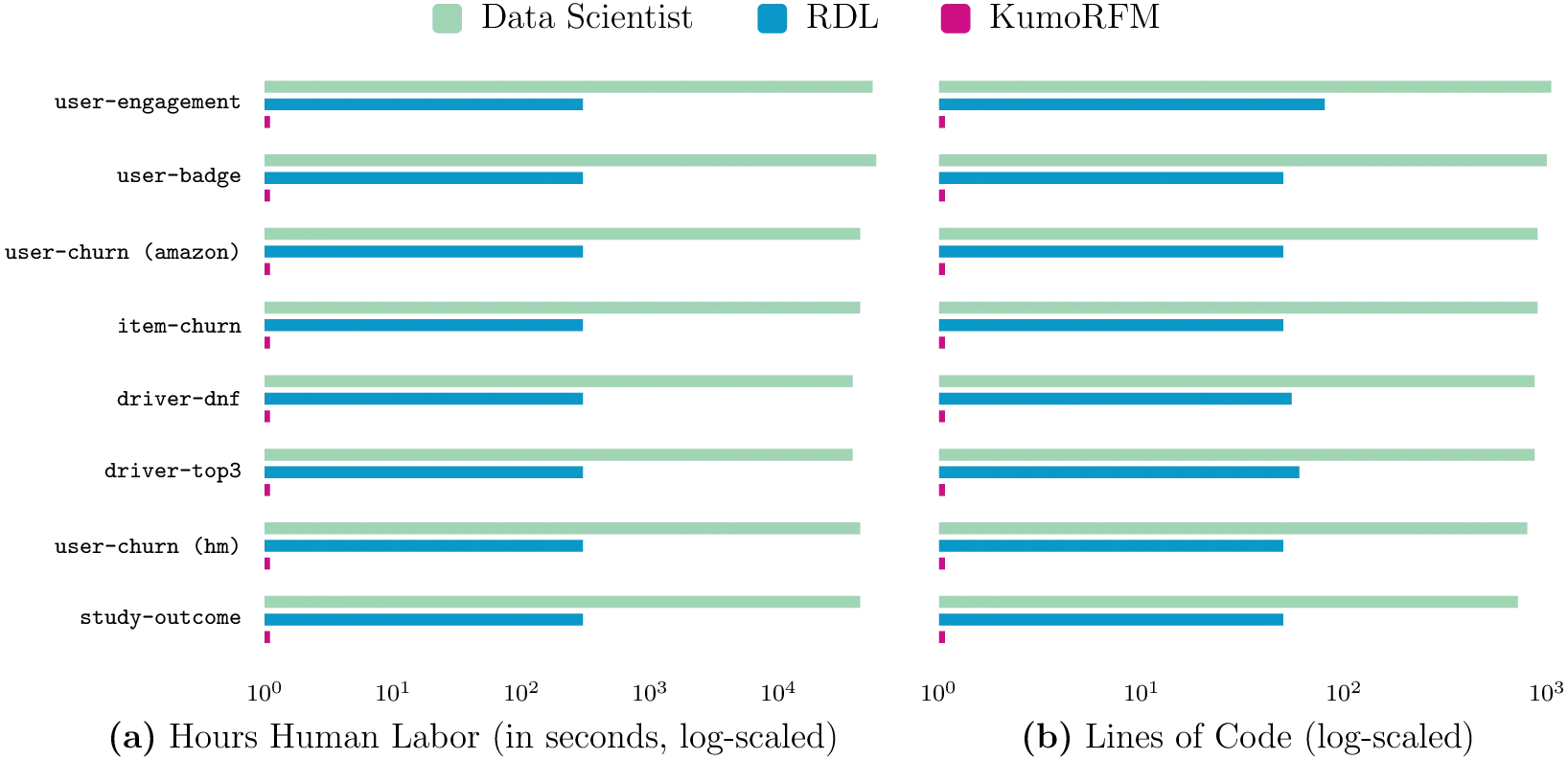 - 디테일하게 KumoRFM 모델을 어떤 데이터를 사용하여 학습시켰는지에 대해 공개하진 않았지만, RelBench 전체에서 제로샷을 수행하였을 때, 지도 학습 기반 ContextGNN보다는 약간 떨어지지만 여전히 훌륭한 결과를 보여줌을 해당 표를 통해 제공하고 있습니다. 하지만 지도 학습 기반 접근방식보다 훨씬 빠르며, 예측 코드 작성이 불필요한 제로코드 솔루션을 제공합니다. 그로부터 최소한의 노력으로도 실시간 예측이 가능한 장점을 언급하고 있습니다.