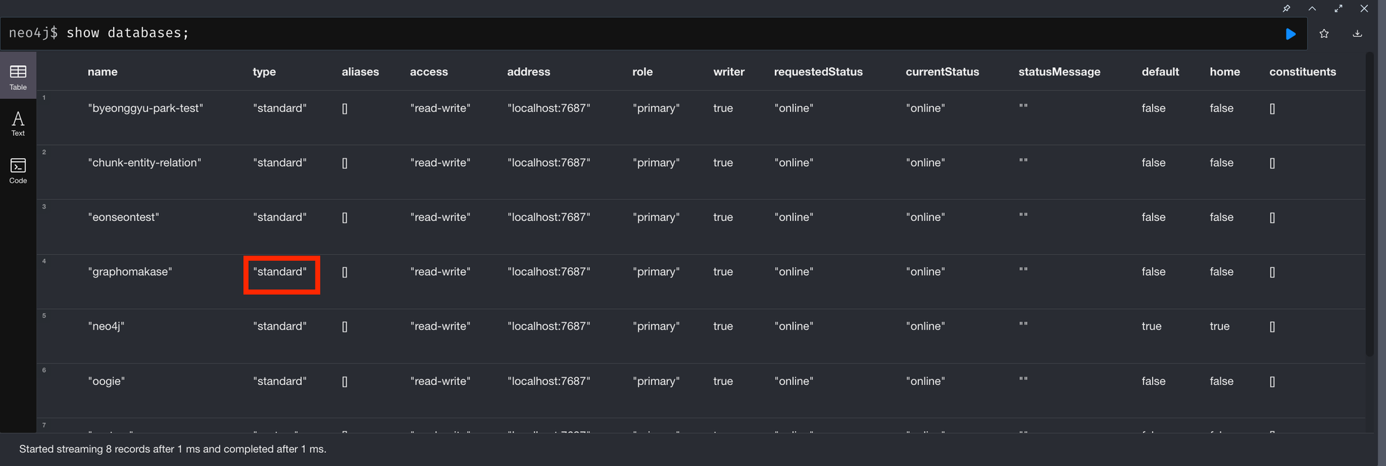하지만 ₩Query across federation and shards, Query across multiple shards₩ 같은 쿼리들은 작동치 않더군요. 의아해서 다시 show database 를 살펴보니, 그 이유를 알게 되었습니다. 아래 그림의 빨간 박스에 있는 standard 가 composite 여야 하는데, 그렇지 않았던거죠. 즉, database type 까지는 지원하지 않았던 겁니다.