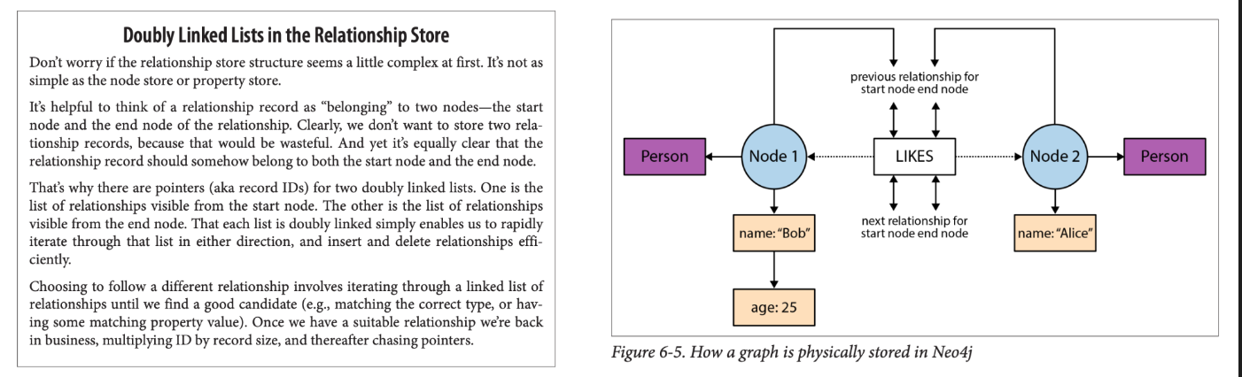 - 각 node, relationship마다 무슨 요소와 연결되어 있는지 특정 offset 마다 Point가 입력되어 있습니다. 이 point 들이 계속 연결되어 있는 형태로 노드,엣지가 구성되어 있는데요. 바로, Neo4j 에서 이야기하는 Linkedlist 가 이를 뜻합니다.