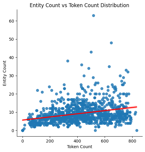 - 산점도를 살펴보면 양의 경향이 있음을 빨간 선으로 보여주지만, 그 관계가 선형적이지 않고 점점 완만해지고 있음을 확인할 수 있는데요. 데이터 대부분은 토큰 수가 증가해도 비교적 적은 엔티티 수 구간에 몰려 있습니다.