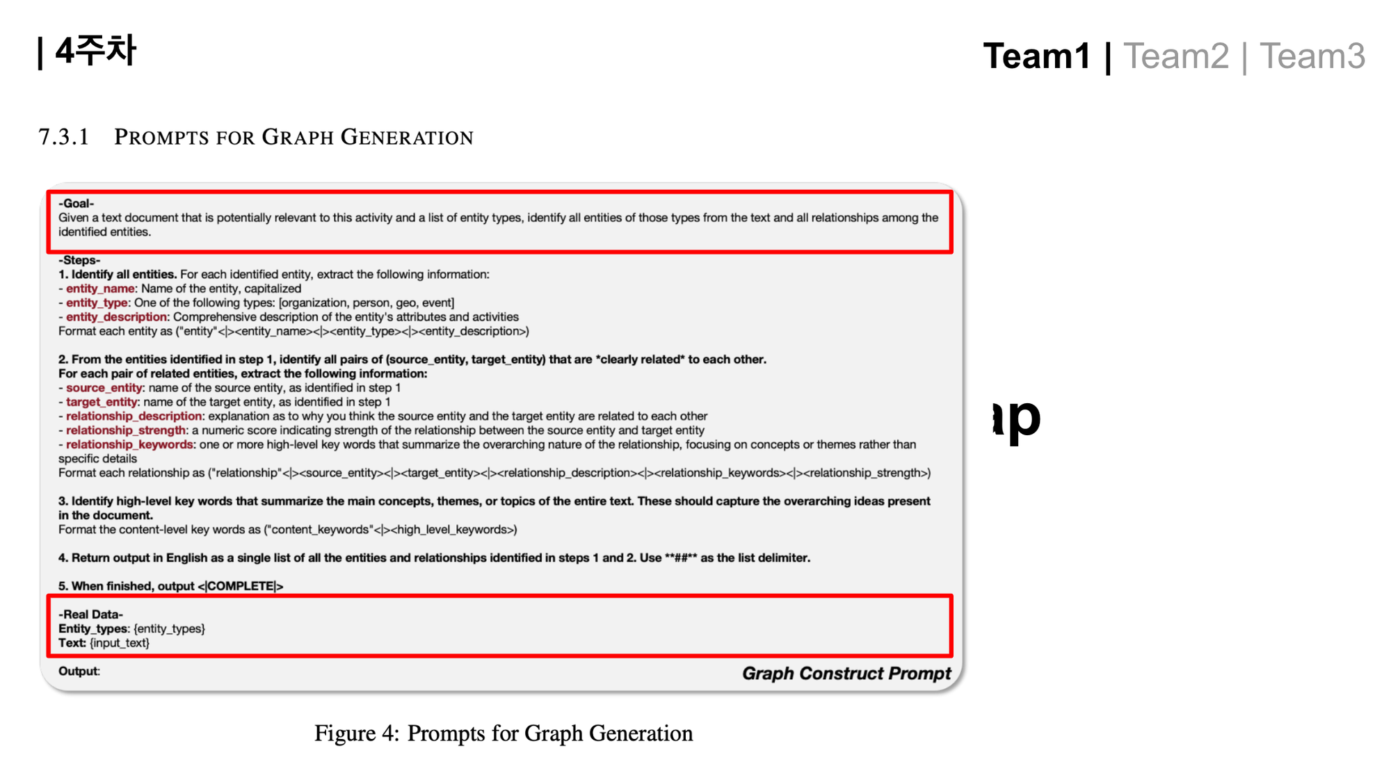 - Team1 에서 prompts for graph generation 요소들 중 Goal & Real Data 를 핸들링하고 있다는 점을 recap 했어요.
