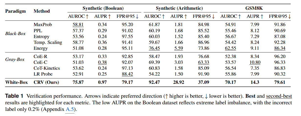 - CRV는 Llama 3.1 8B Instruct 모델과 합성 데이터셋(Boolean, Arithmetic) 및 실제 데이터셋(GSM8K)에서 평가되었습니다. 결과적으로 기존의 검증 방법론 (Black / Graybox)를 뛰어넘는 성능을 보였습니다. AUROC, AUPR, FPR@95 지표에서 일관된 향상 결과를 보이며, 추론 단계에 존재하는 구조적 특징이 정확성을 직접 검증할 수 있는 풍부한 신호를 포함한다는 주장을 뒷받침합니다.