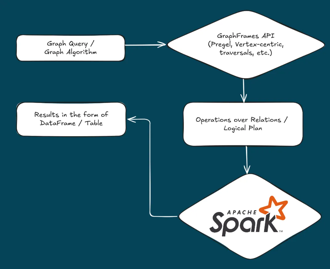 - GraphFrames가 제공하는 API는 Spark의 강력한 쿼리 최적화 프레임워크와 효율적인 메모리 관리를 위한 실행 엔진을 통해 전체 연산 시퀀스를 자동으로 최적화하고, DataFrame(SQL 테이블과 유사한 분산 데이터 구조) 기반 인터페이스를 통해 관계형 쿼리와 그래프 분석 및 알고리즘을 자연스럽게 통합하도록 설계되었습니다.
