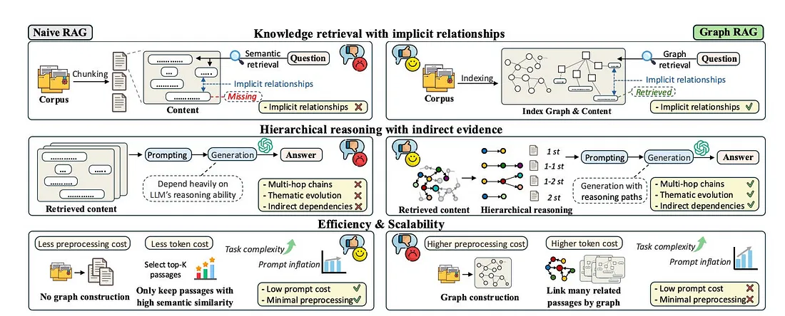 - 자연스럽게 GraphRAG는 대규모 비정형 도메인 상의 코퍼스를 처리할 때 컨텍스트 정보 손실을 방지하기 위해 그래프 구조를 활용하여 LLM의 컨텍스트 이해 능력을 향상시킬 수 있다는 부분에서 큰 관심을 받았습니다. 하지만 최근 연구들은 GraphRAG가 실제로 RAG보다 성능이 떨어지는 경우가 잦다는 사실을 보고하며, GraphRAG가 정말 효과적인지, 어떤 시나리오에서 이점을 갖는지에 대한 의문을 제기합니다.