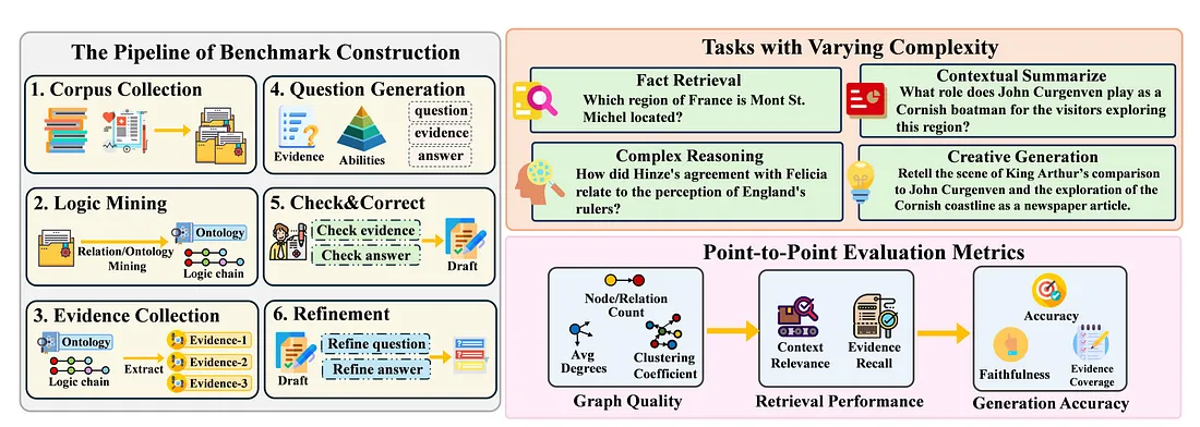 - 논문의 다음그림은 GraphRAG-Bench를 크게 세 가지 핵심 구성 요소로 나누어 보여주고 있습니다.