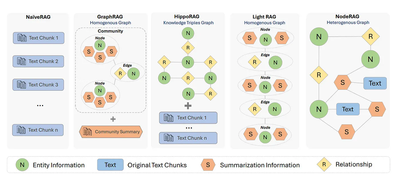 - NodeRAG : 위의 방식들과 다른 접근 방식을 취합니다. 상위 요소, 의미 단위, 관계와 같은 여러 유형의 노드(Heterogeneously)를 사용하여 관련 없는 정보를 줄이는 동시에 보다 정확하고 계층적인 검색을 가능하게 합니다.