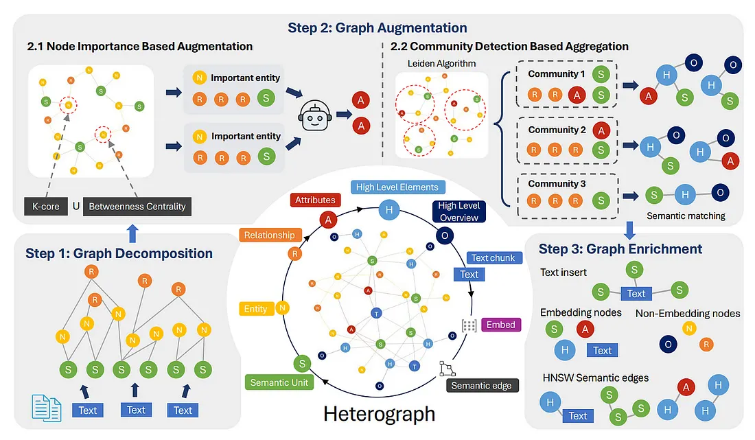 - 그래프 증강 (Graph Augmentation) : 핵심 엔티티와 같은 주요 노드를 식별하고, 그 중요성을 강조하기 위해 Attribute Node(A)를 생성합니다. 또한 커뮤니티 감지를 통한 고수준의 인사이트를 포착하고, High-level Elements (H)와 High-level Overview (O)를 생성합니다.