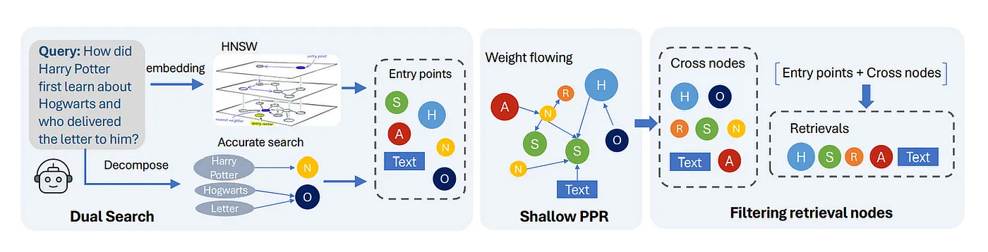 - 이중 검색(Dual Search) : 쿼리에서 Entitiy와 Semantic cues를 추출하는 것으로 시작합니다. 그런 다음, (N,O) 노드에서 정확한 일치를 검색하고 (S,A,H) 노드에서 벡터 유사성 검색을 결합하여 가장 관련성 높은 항목 노드를 정확하게 찾아냅니다.